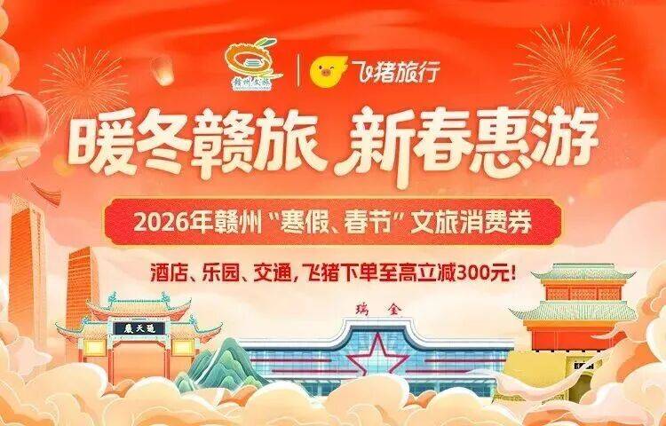 活动内容:赣州文旅消费券重磅上线!飞猪+同程双平台齐发,境内外游客、本地居民通通能享受;发放种类覆盖酒店(享7折优惠,最高满减300元)、景区(享5折优惠,最高满减300元)、机票(满300-100元)、火车票(40-20元),赣州多数酒店随心住,热门景区畅快玩。