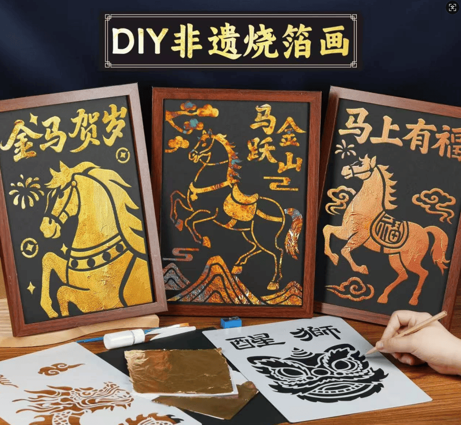 活动内容:解锁富贵感,马年金箔画DIY!听非遗老师讲金箔历史,市民游客亲手贴金勾勒骏马,一步步完成专属的马年金箔作品。